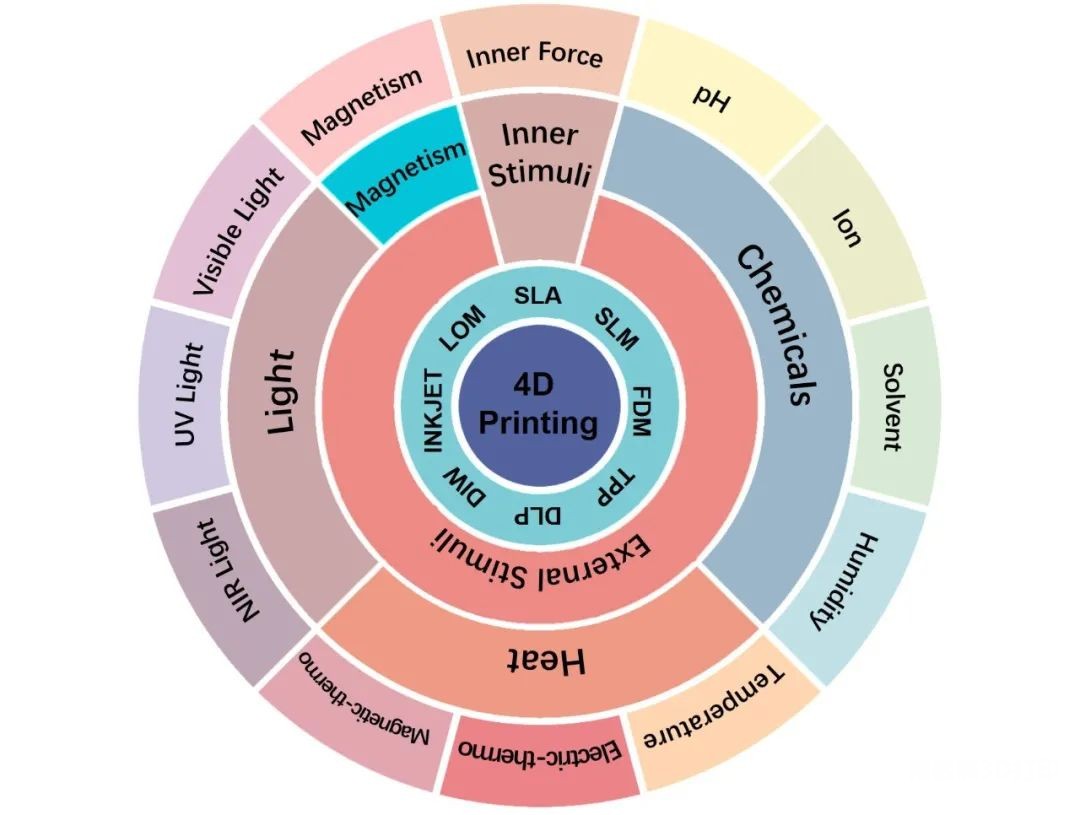 图1:4D打印工艺的刺激源可分为内部刺激和外部刺激,以及内应力、磁性刺激、光刺激、热刺激和化学刺激五大类及其子类型
