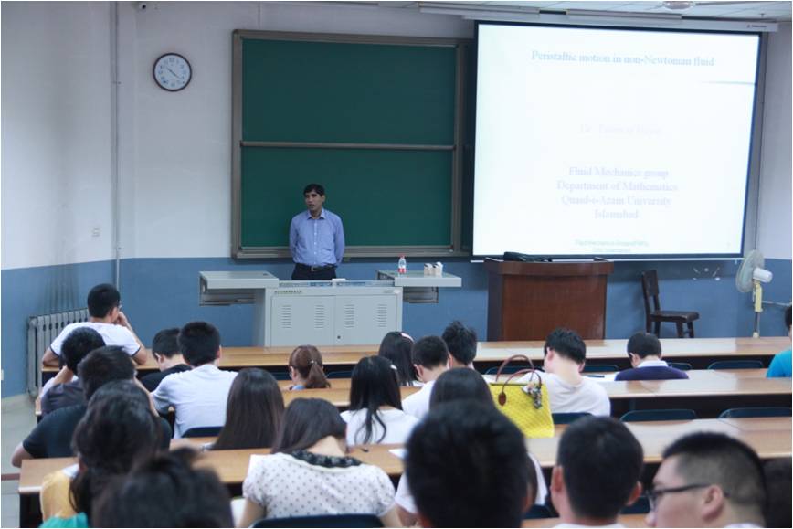 9月5日上午, Hayat教授在北校区阶梯教室J-508为我校师生做了题为“Peristaltic Motion of a Magnetohydrodynamic Generalized Second-Order Fluid in an Asymmetric Channel”的精彩报告,极品尤物一区二区三区小说150余名师生参加了报告会。