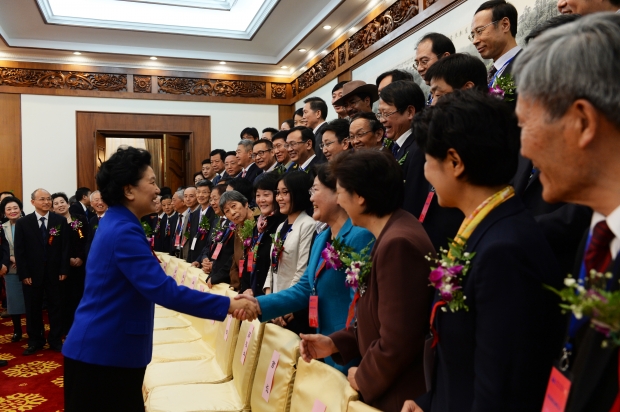 中共中央政治局委员、国务院副总理刘延东与2014年度何梁何利奖获奖人亲切握手