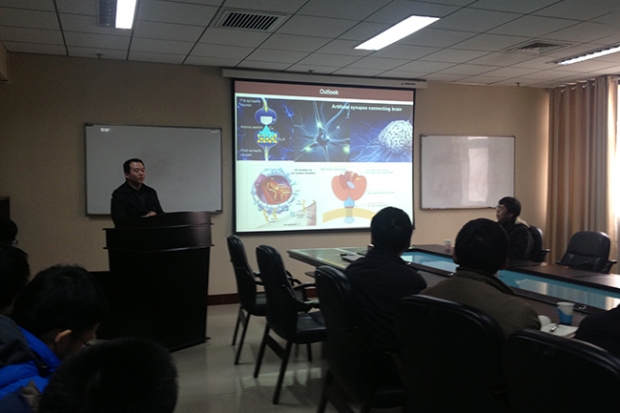 报告会上,耿佳博士首先以阵列天线电子器件与生物材料的耦合作用为切入点,详细介绍了生物-电子器件界面中,碳纳米管通道在生物电子信号转导、控制并物质流动选择中的重要作用与重大成果进展(该成果发表在2014年Nature)。此外,他还结合自己的科研经历,讲解了多学科领域研究的方法与突破点。