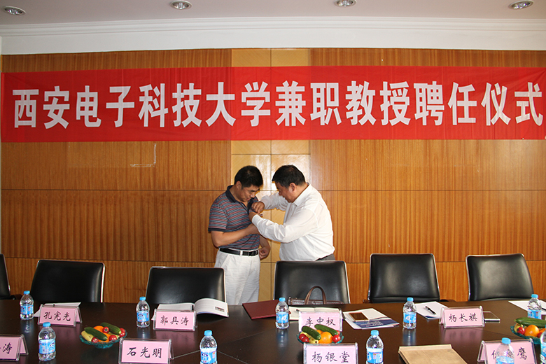 聘任仪式上,仇原鹰介绍了李中权研究员的个人简况。杨银堂副校长宣读了聘任文件、颁发聘书并为李中权研究员佩戴了我校校徽。随后,杨银堂在致辞中对李中权研究员为我校与八〇〇所的科研交流,产学研合作等付出的努力做出了充分的肯定。他指出,八〇〇所与我校“可靠性试验与仿真联合实验室”的成立标志着我校与八〇〇所的合作进入实质性阶段,将在我校科研产业化的实现,学生培养、就业,双方合作创新等方面实现多赢。