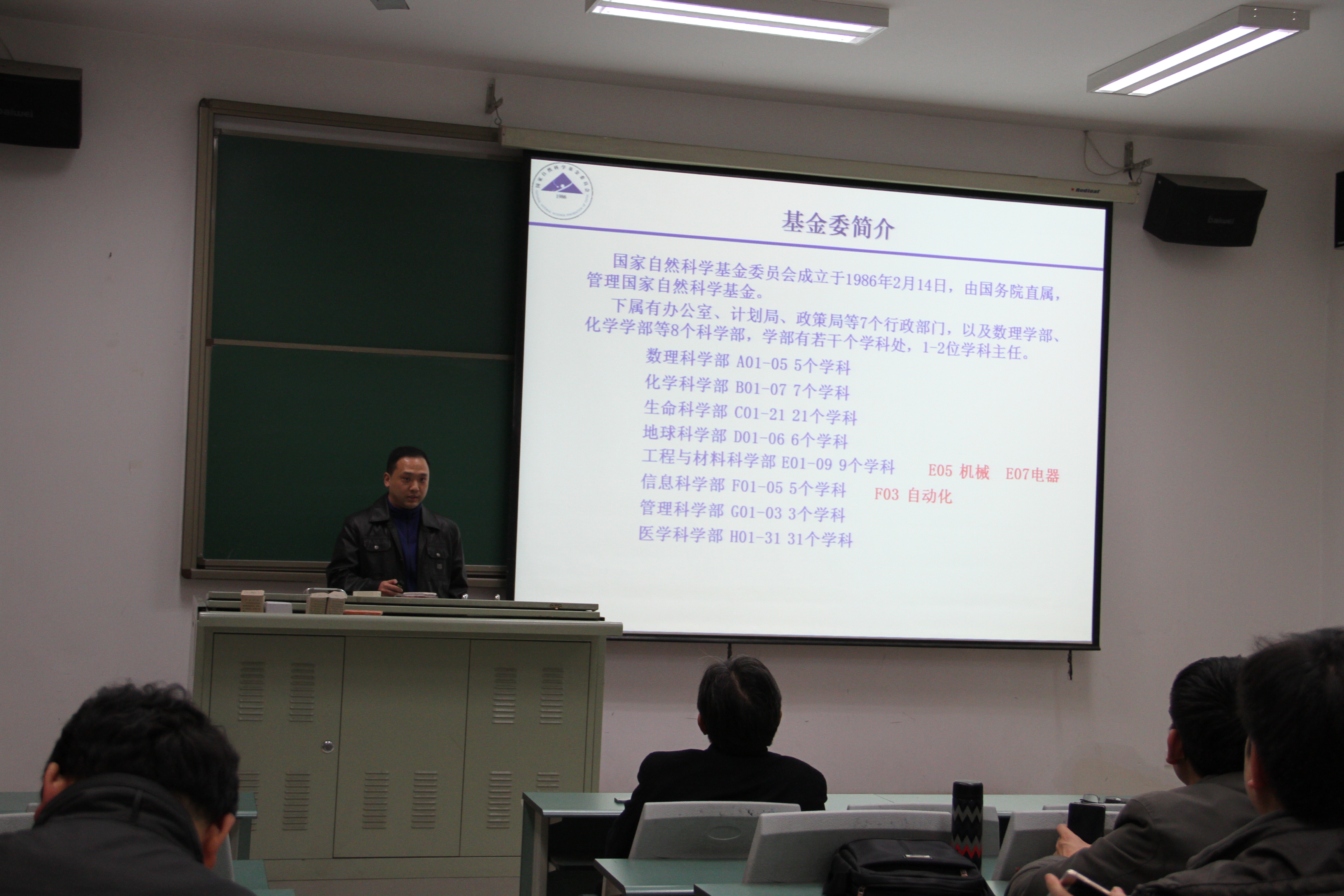 黄进副院长代表学院教师对科学研究院一直以来的支持和帮助表示感谢,他指出随着国家“十三五”科研体制的变化,大项目申报的技术系统性强度和指标硬度对高校来说越发困难,国家自然科学基金是现阶段广大教师知识自由探索的最佳途径,希望学院教师能够梳理清楚研究方向,结合国家战略发展趋势,提出更有创新性的立意,共同努力使学院的基金申报工作再上一个新台阶。