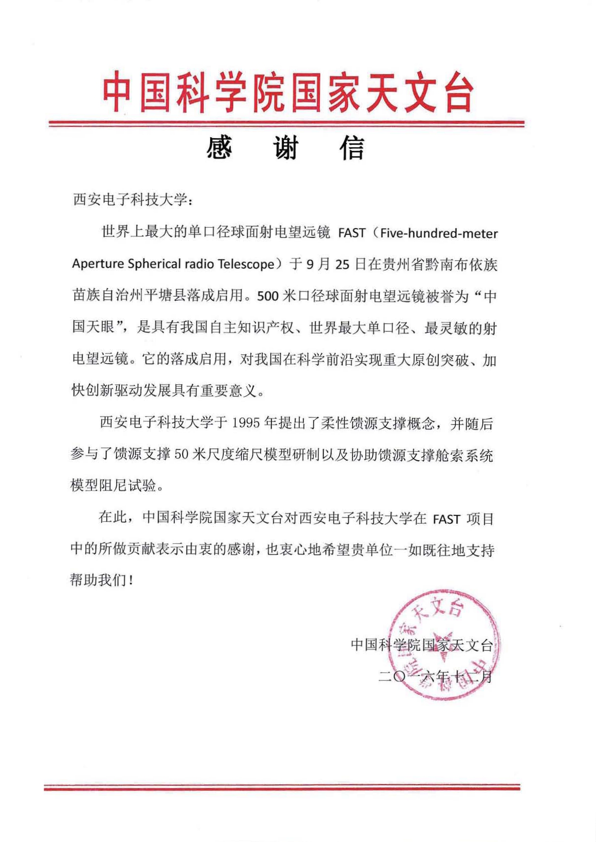 近日,中国科学院国家天文台专门发来感谢信,感谢西安电子科技大学段宝岩院士及其团队为世界最大的单口径球面射电望远镜FAST的研制所做的重要贡献。