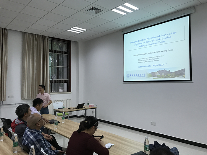 8月30日上午,在北校区主楼三区第三会议室,首先,秦家虎教授作了“Distributed k-Means Algorithm and Fuzzy c-Means Algorithm for Sensor Networks Based on Multi-agent Consensus Theory”的学术讲座,报告会由极品尤物一区二区三区小说自控系主任张强教授主持,来自西安电子科技大学60余人参加了学术报告会。报告中,秦家虎教授首先介绍了传感器网络系统分布式控制的基本问题,对传感器网络动态、拓扑结构、分布式协议等进行了详细的介绍。重点介绍了传感器网络的分布式K-均值和模糊K-均值算法研究,其中包括问题的提出和建模、聚类定义和中心质点以及更规则等。最后介绍了将来的研究热点和发展趋势。秦家虎教授的报告内容既具有理论上的创新性又紧贴实际工程应用,引起了广大听众的共鸣。最后秦教授现场与广大师生进行了热烈的交流和讨论,他详细解答了每一个提出的问题,到场师生表示受益匪浅。