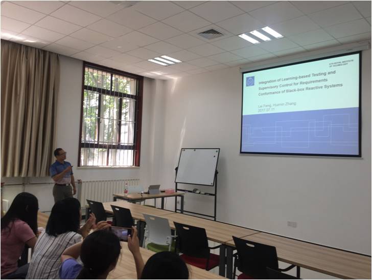 报告介绍了用监督控制理论来消除黑盒软件在重复利用时可能出现的错误。该方法利用基于自动机学习的软件测试方法来学习黑盒软件的模型,从而可以利用监督控制理论来纠错。这一项工作是监督控制理论的一个创新应用,对我校从事离散事件系统监督控制理论与应用研究领域的研究生与青年教师具有启发性。学术报告引起了与会师生的浓厚兴趣,大家结合自己在研究中遇到的问题与冯雷博士进行了积极交流。
