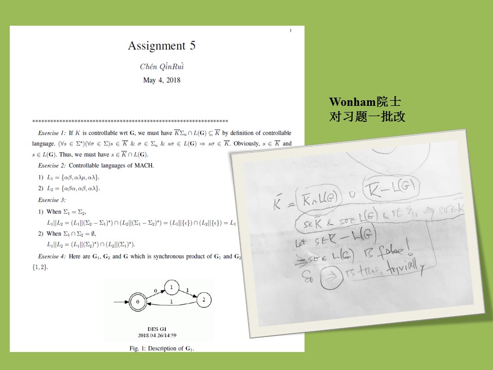 Wonham院士已是耄耋之年,他的课程仍然充满激情,除了演示TCT软件外,其余内容均采用板书授课,讲授方式高屋建瓴,深入浅出,用风趣的比喻解释复杂的控制思想,与台下学员积极互动,每堂课均留有课后习题。Wonham院士对基本的数学知识都给出深刻的见解与巧妙的运用,他扎实深厚的学术功底让人折服;对抽象概念的生动解释将大师风范展现的淋漓尽致。