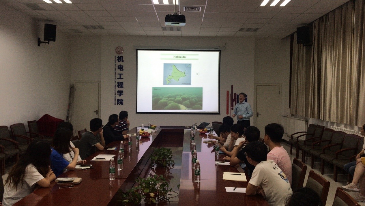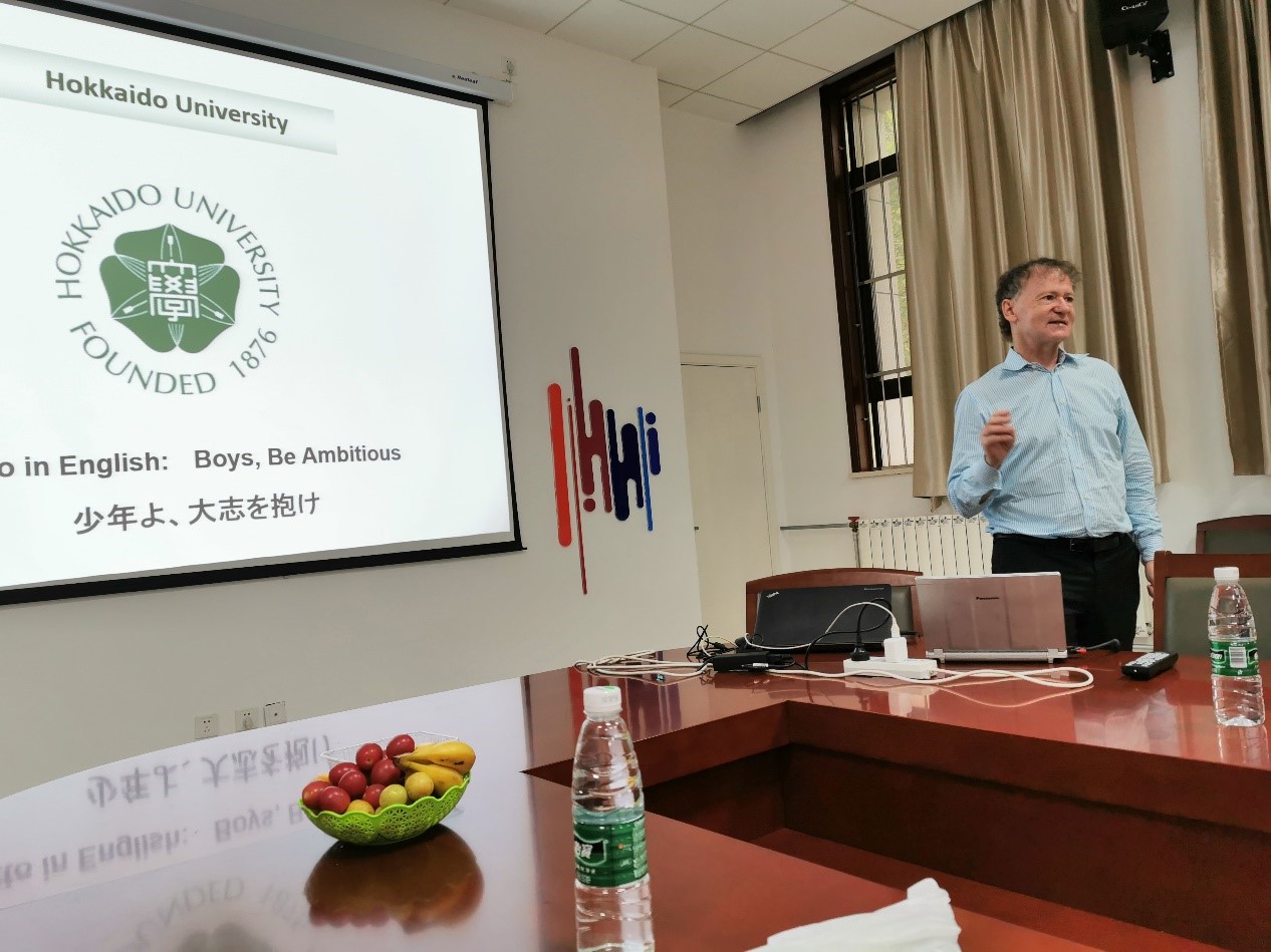 Wright教授用生动的语言像我们介绍了他所任职帝国七校之一的北海道大学,以及北海道的中心城市札幌。Wright教授开玩笑的说到:“不用担心,札幌的街道没有熊。”接着Wright教授简单介绍了他所研究的项目。他用精妙的语言,生动形象的例子,把原本生涩难懂的物理知识讲的生动有趣。同学们和老师们都听的津津有味。