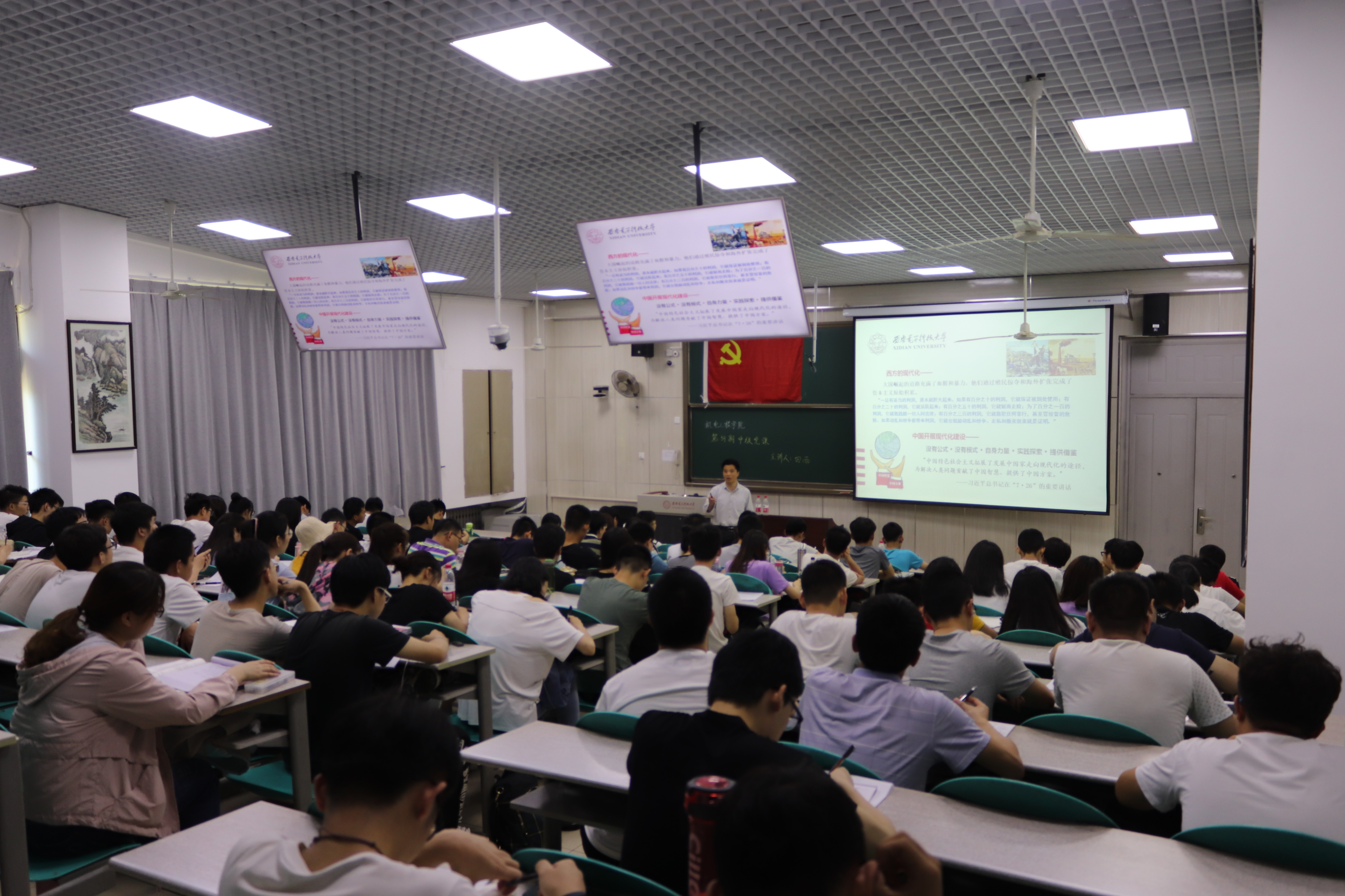 下午16时25分,学员们陆续进入教室,有序签到后纷纷落座。田书记以“为什么要加入中国共产党”这一问题为引,开始了本次授课。田书记指出,正是中国共产党的出现,才使得中国人民站了起来。他以中国用40年时间成为世界第二大经济体为例,指出在中国共产党的正确领导下,中国人民才富了起来,也正是在中国共产党的带领下,中国正逐步建成社会主义强国。