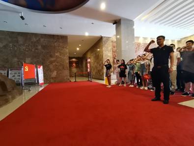 上午9点,所有师生准时到达扬州革命烈士纪念馆,并在纪念馆门口合影留念。然后,电子封装系师生进入革命烈士纪念馆,在馆内面向烈士纪念碑整齐列队,高举右手,面向鲜红的党旗庄严宣誓,如图2所示。通过重温入党誓词,大家深深感受到党员的责任、使命和荣耀。大家纷纷表示,不论是在学习还是工作中都要时刻以党员的标准严格要求自己,继续发扬先烈的革命精神,立足岗位,践行对党的庄严承诺。