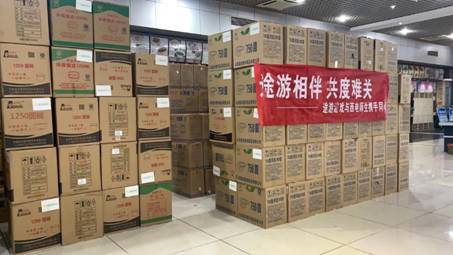 本批抗疫物资共计有1次性餐盒400箱(1250ml和750ml圆形餐盒各200箱,共计10万套)、防护隔离服5箱(共计300套)、消毒湿巾30箱(共计9.6万片),目前已全部投入学校抗疫工作中。