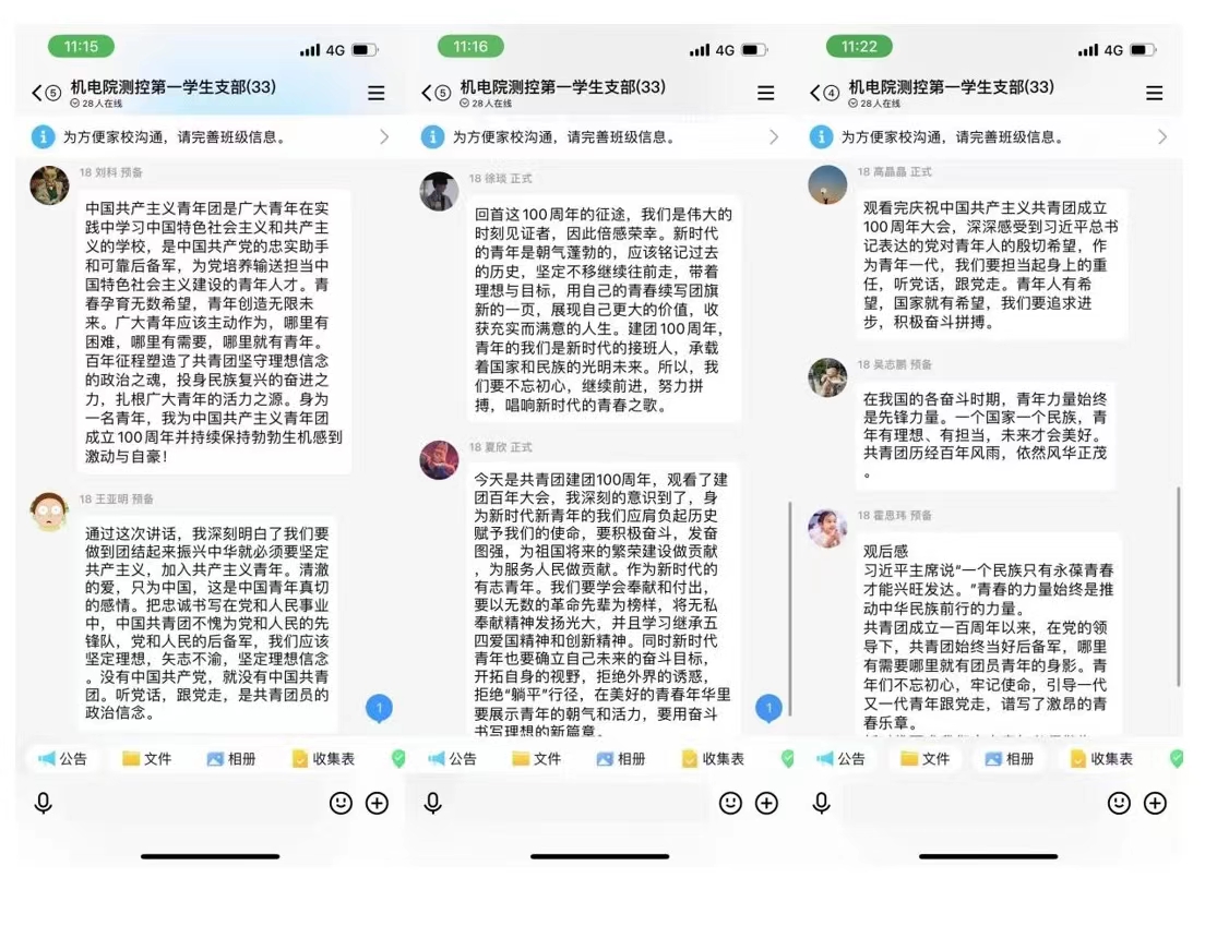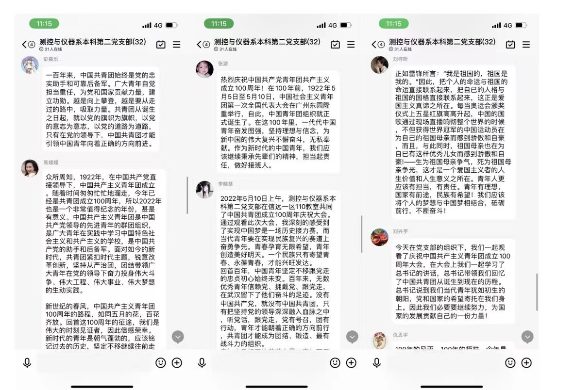 习近平总书记在发言中提到:“越是往前走、向上攀,越是要善于从走过的路中汲取智慧、提振信心、增添力量。一百年来,共青团坚定理想、矢志不渝,形成了宝贵经验。这是共青团面向未来、再立新功的重要遵循”。在会后的讨论环节,各位学生党员围绕习近平总书记的重要讲话精神,结合自身工作、学习、生活等方面展开了讨论学习。