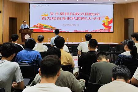 评选会后,陈武为同学们作了主题为“矢志勇担科教兴国使命,着力培育新时代四有大学生”的主题党课。 陈武从党的二十大的重大意义、深刻领会党的二十大的主题、过去5年的工作和新时代10年的伟大变革、坚持科技是第一生产力、人才是第一资源、创新是第一动力等方面进行了宣讲。他认为,作为大学生党员,要深刻领会党的二十大精神实质,夯实理论根基,深刻领会新时代新征程中国共产党的使命任务,深刻领会中国式现代化的中国特色和本质要求,坚定中国特色社会主义道路自信、理论自信、制度自信、文化自信。他希望,全体党员要强化理想信念,增强使命担当,踔厉奋发勇担国家使命,矢志创新彰显青年担当,牢记习近平总书记对当代青年的殷切期望,扎根中国大地,立志成为德才兼备,具有强烈家国情怀、具有原始创新能力、具有解决关键核心问题能力的青年科技创新人才,用实际行动为全面建设社会主义现代化国家、全面推进中华民族伟大复兴贡献力量。陈武为全体毕业生党员送上祝福,感谢他们用激昂的青春为学院的建设发展增光添彩,衷心祝福同学们在科技报国的道路上乘风破浪、前程似锦。