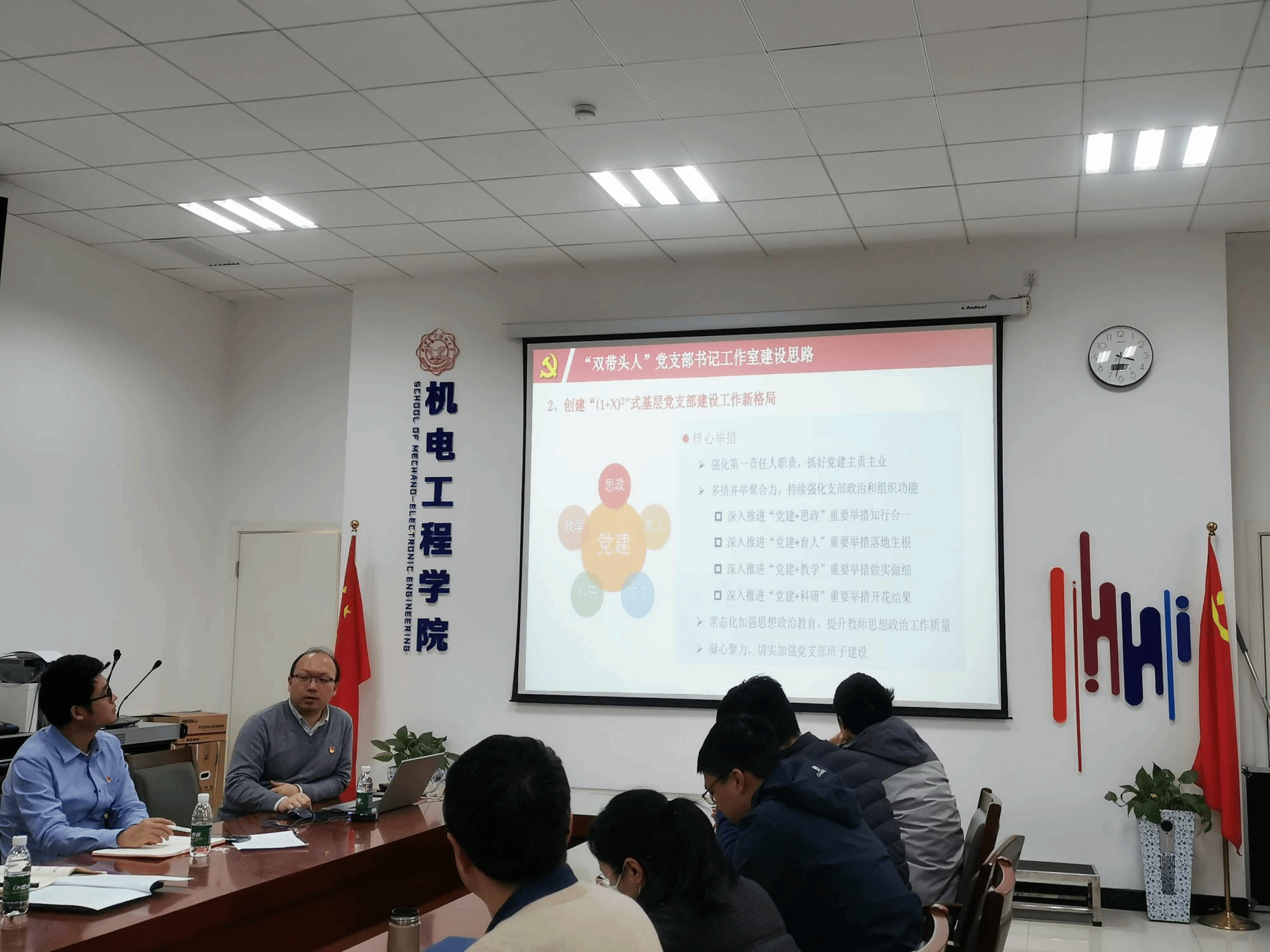 随后,王靖宇教授介绍了西北工业大学航天学院的党建工作理念,着重探讨了在学校推动“双一流”建设的新形势下,研究所党支部所面临的一系列新困难以及探索出的一整套培养“双带头人”、“(1+X)^2”式基层党支部的工作经验,从建设格局、阵地建设、业务融合创新机制以及具体实施举措等四个方面介绍了开展基层党建工作的核心措施,分享了西北工业大学无人系统制导与控制研究所党支部“1234N”本研全周期党建育人新模式和“矩阵式”党建业务融合创新机制,并介绍了校院企业支部共建等多方面工作的开展情况和下一步工作举措。