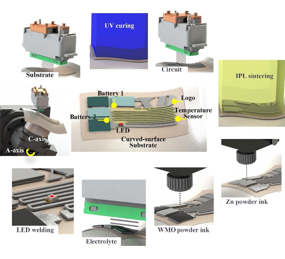 相比于传统的平面电路,曲面共形电路在空间优化、便携性、集成能力、响应速度和可靠性等方面有着明显的优势。这些优势是在科学探索中设计和实施各种电子设备和系统的重要技术手段。为此,研究团队利用增材制造技术,基于全自研的五轴联动曲面多材料打印设备,在非可展开曲面上制造出具有掺钨二氧化锰阴极的水性锌离子电池。五轴联动运动系统有助于缩短紧凑型电池的离子传输路径,并确保精确、高效地成形非可展开曲面。之后,将打印电池与纳米银蛇形电阻温度传感器集成,并利用强脉冲烧结技术实现集成功能电路的快速烧结。电路中集成的发光二极管可通过 LED 亮度的变化测量温度。载体表面高度吻合的储能模块具有体积小、空间利用率高的优点。在曲面上一体化成形功能电路的能力为储能技术的创新提供了新的途径,为实现共形器件的一体化快速制造提供了解决方案。