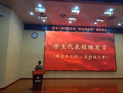 程颐代表获奖学生作了题为《践青春之行,筑科技之梦》的主题分享。他引用习近平总书记的论述激励在座学生,当代中国青年是与新时代同向同行,共同前进的一代,身逢盛世肩负重任,青年兴则国兴,青年强则国强。在分享中,他还特别强调了作为机械设计制造及自动化专业的同学,实践的重要性,通过参加多项科技类竞赛,在实践中对自身能力的不断磨砺,能够全面提升自身综合素质,同事也体会到团队合作的重要性,鼓舞同学们努力学习,积极参与竞赛,在合作中寻求共同进步。