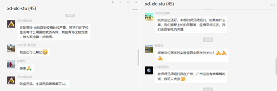 实验室同学主要分布在西安本部、广研院、杭研院,还有部分在职博士研究生在山东青岛、河南新乡等地,身处西安之外的同学十分牵挂和关心本部同学安危,叮嘱同学们做好疫情防控要求,并主动为西安实验室同学提供力所能及的帮助。