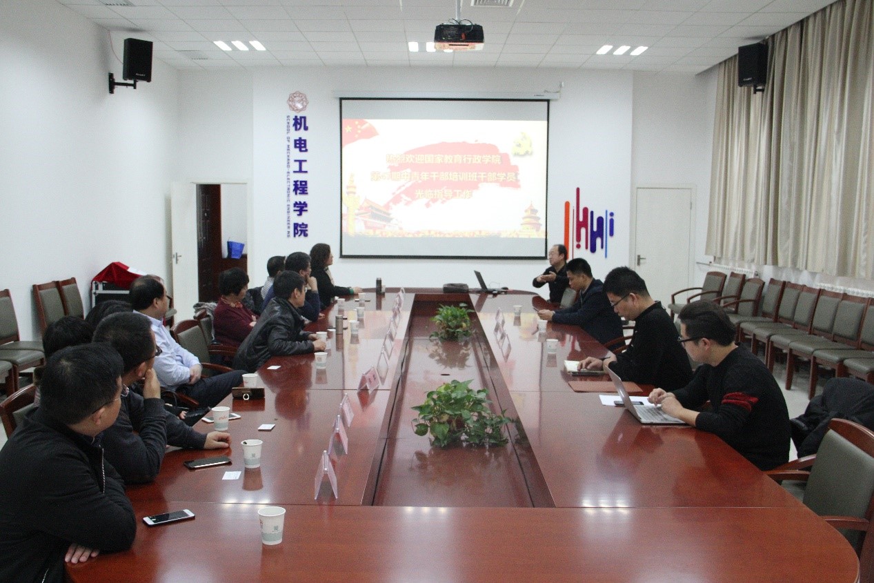 (通讯员 赵宇 曾子杰)12月22日,国家教育行政学院第47期高校中青年干部培训班的十多位学员在国教院于鲁文教授带领下来到我院,就院系智慧党建、信息化建设及创新型人才培养等事宜进行调研交流。座谈会议在北校区主楼III区145北会议室举行,机电院党委书记梁玮、执行院长黄进、党委副书记田雨以及学院智慧党建工作相关人员参加了座谈会。会议由梁玮主持。