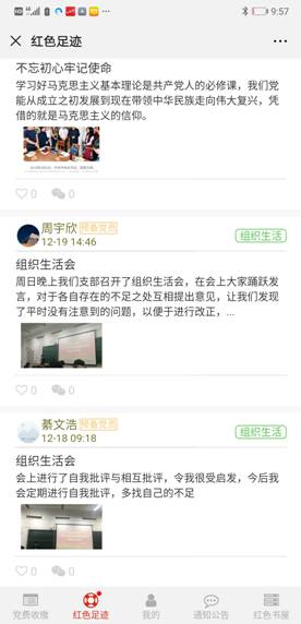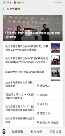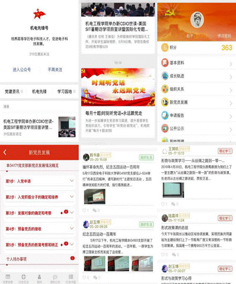 5.利用信息化手段促进基层党组织建设效率提升。依托学院党建微信公众平台“机电先锋号”搭载的“一云台两专栏四推送”---即“党建云”智慧管理系统平台,“党建资讯”、“特色栏目”两个专栏将党章党纪党规和专题教育的相关内容融于其中以及每月推送四次党建要闻宣传党的政策、传达上级精神、交流“不忘初心、牢记使命”主题教育的工作经验。特别是通过“机电先锋”党建云智慧管理系统平台大大提高了基层党组织的工作效率:通过“党费收缴”实现党费一键“秒交”,每月按时交党费,永远不忘共产党员身份;通过“红色足迹”方便分享党员个体的学习体会和成长经历,拉近了心与心的距离;通过“91精品国产”把中央要求、上级文件、工作安排轻松放到每个党员口袋里;通过“红色书屋”把成千上万本理论书籍摆到大家面前,网上下单分分钟送到;会议通知、电子签到、党务公开、组织建设一个个功能真正做到整合资源、充实数据、科学运用、优化机制,营造“红色空间”党建氛围,切实提升了学院基层党建工作的质量。今年主题教育以来为解决党员发展中的规范化问题我们新上线“党员发展”模块将党员发展的“五大步25小步”融入系统实现线上线下党员发展全流程辅导,全过程纪录。我院《打造“智慧党建”创新平台,提高基层党建工作水平——以“机电先锋号”创新平台建设为例》也荣获了校十佳党建特色案例。