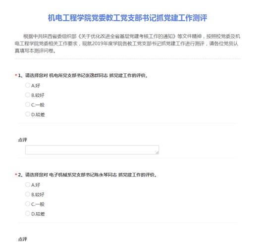 针对学生支部,学院以线上多角度测评、线下考核表进档案等方式,开展述职考核工作。学院党委分别制作了《机电院学生党支部工作年终考核测评(发支部党员)》、《机电院学生党支部工作年终考核测评(发联系党委委员)》、《机电院学生党支部工作年终考核测评(发党务干事)》三份线上考核问卷,结合各学生党支部工作实际,从支部日常工作开展情况、战斗堡垒作用发挥情况等各方面,向支部党员、联系党委委员以及学院党务干事征求评价意见,形成线上评价结果。召开学生党总支支委会,对照三类线上评价结果及党支部成员党费交纳情况、活动参与情况等方面由学生党总支支委委员填写《2019年度机电院学生党支部考核测评问卷(发学生党总支支委)》进行打分,提交学院党委会形成最终评价结果,评价结果记录入《极品尤物一区二区三区小说学生党支部委员年度考核表》,并将考核表放入支委委员个人档案。